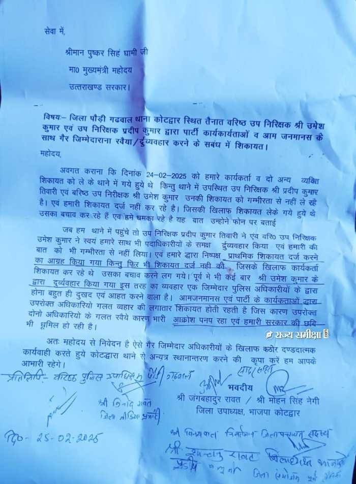 कोटद्वार पुलिस के रवैये से भाजपा कार्यकर्ता नाराजभाजपा जिला उपाध्यक्ष की प्रतिक्रियासोशल मीडिया पर उठी पुलिस की आलोचनामुख्यमंत्री से निष्पक्ष जांच की मांगआंदोलन की चेतावनी